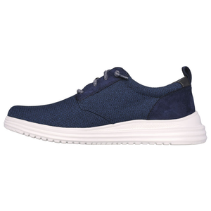 Proven Gladwin is a super comfortable casual mens shoe from Skechers in a classic fit featuring a woven textile upper in navy with inspiration from a classic oxford style. Complete with suedette panelling to the heel and laces, along with dark brown synthetic leather trim. Finished with a casual white sole unit with a textile lining and an Air-Cooled Memory Foam insole for comfort. Fastened by laces for a secure fit.