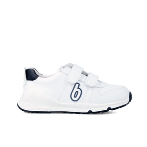 A comfortable boys fashion trainer from Biomecanics for him. In white with blue detailing. Fastened with two velcro straps for that perfect fit. Featuring a removable insole for custom inserts to be used. Crafted from high quality leather. Finished with a tag to the collar.