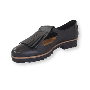 Work the t-bar look in Lolo Strap from Lauren Thomas, this sweet shoe offers two looks for the price of one, with removable fringing, in a super soft black leather with an edgy cleated sole. Fastened with a buckle across the vamp and finished with a mix of textile and synthetic leather lining.