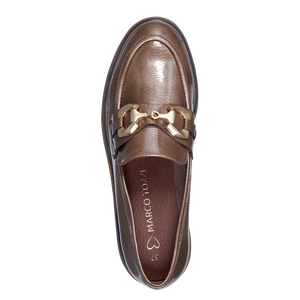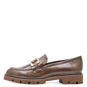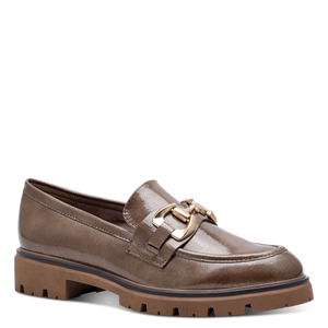 Slip into comfort and style with the ladies loafer from Marco Tozzi. Crafted in a lovely taupe patent synthetic material. The 40mm chunky heel offers a chic look. Finished with a gold detail to the vamp.