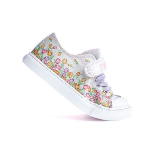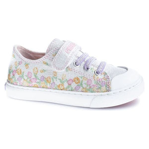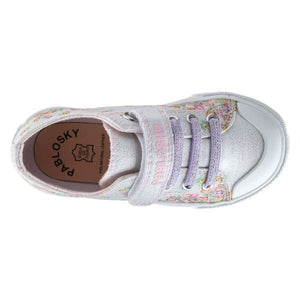 A classic pair of girls shoes from Pablosky. Featuring a top quality material that ensures comfort and support, with a lovely shimmering silver and floral design. Fastened with purple bungee laces and a velcro strap. A removable natural leather insole suitable for custom insoles. Finished with a flexible, non-slip and tear-resistant rubber sole.