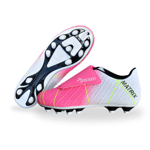 Introducing the Matrix Velcro Firm Ground Football Boots, specially designed for young football enthusiasts who are ready to conquer the field with style and confidence. These boots are engineered with precision and crafted with care, ensuring optimal performance and comfort for budding stars.The padded interior and cushioned insole provide a snug fit, reducing discomfort during prolonged gameplay. Kids can focus on their performance without worrying about discomfort or blisters. Firm Ground. In pink and white with green detailing.