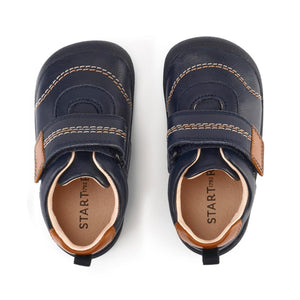 A fun boys walking shoe from Startrite, Footprint has soft navy leather uppers complimented by tan leather panels with contrasting tan and beige stitching.  Complete with an easy fasten velcro strap, padded collar and a flexible rubber sole with bumper toe to aid against scuffs and scrapes.  Lined in soft leather with a comfortable leather footbed.