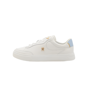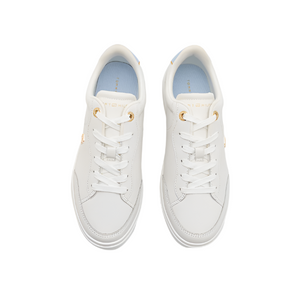 A classic womens court sneaker from Tommy Hilfiger to update your look. The Womens Trainer Essential Chic Court Sneaker is designed in a chic white with a soft blue and gold panel to the collar. Fastened with laces and large gold eyelets to add to the look. Finished with a padded collar and a soft padded insole.