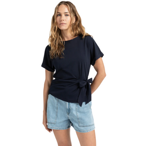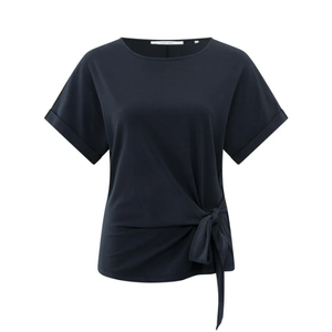 Crafted from soft, comfortable jersey fabric, this feminine T-shirt from YAYA offers a regular fit with a refined twist. It features a classic round neckline and short sleeves with fixed turn-ups. A unique knotted detail at the side creates a flattering silhouette, making this a perfect casual piece for everyday wear.